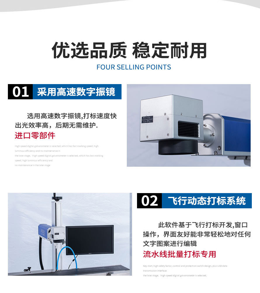 2、在線式飛行激光打標機直接與流水線配合,減少人工成本,操作人員可以避開惡劣生產環(huán)境。 3、滿足標記打標的多樣化需求,自動化生產、流水線生產、以及非常規(guī)界面材質的需求。 4、功能強大,具有較強的文字編排和圖形處理功能,可自動生成批號和流水號、跳號。 5、省電節(jié)能,整機功率僅600W,一小時不到1度電。" />
